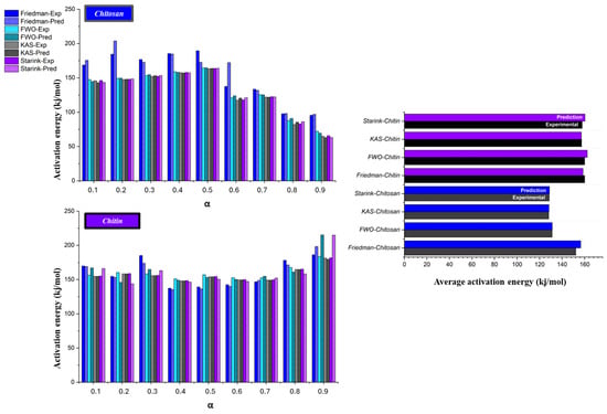 Figure 5 presents a comparative analysis of the variation in activation energy as a function of the degree of conversion for both chitin and chitosan. Additionally, different kinetic models have been evaluated and compared. For this purpose, the Friedman, Flynn–Wall–Ozawa (FWO), Kissinger–Akahira–Sunose (KAS), and Starink iso-conversional methods were analyzed. The kinetic parameter calculation for the carbonization of chitin and chitosan was calculated assuming a reaction order of unity (using the fractional conversion function f(α) = (1 − α)n, as suggested by White et al. []. This approach is supported by findings that the thermal degradation of these macromolecules closely follows an apparent first-order reaction model, which effectively approximates their decomposition kinetics []. Specifically, the reaction order being close to unity is consistent with previous studies, which have shown that a first-order kinetic model sufficiently describes the thermal degradation behavior of both chitin and chitosan. To calculate the pre-exponential factor (A), the Friedman method was employed due to its ability to provide accurate estimates through a direct differential approach, correlating the reaction rate with temperature at constant conversion levels. This method complements the activation energy determination from iso-conversional analysis by avoiding integral approximations, thereby yielding reliable kinetic parameters even for complex degradation processes. Figure 5 demonstrates that the Friedman, FWO, KAS, and Starink models exhibit a similar trend in activation energy values across conversion degrees ranging from 0.1 to 0.9. This means that the thermal degradation process follows a similar pathway, regardless of the specific kinetic approach used. To put it in other words, the similar trend in activation energy estimation across different methodologies suggests that the material exhibits intrinsic kinetic behavior that is accurately captured by all four models. However, variations in numerical values were observed across the utilized models, attributable to differences in their underlying assumptions and approximations.