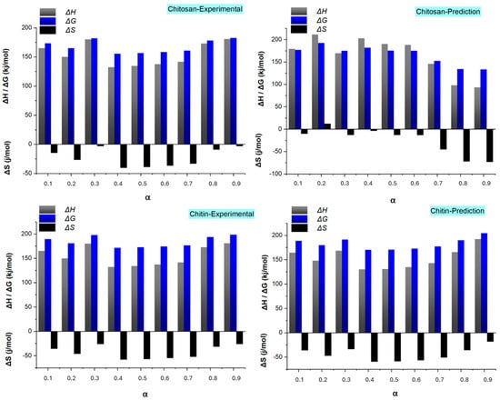 When Figure 6 was carefully investigated to determine instantaneous changes in the thermodynamic parameters, ANN predictions for chitin demonstrated better accuracy in instantaneous estimations when compared with those for chitosan. These findings indicate that the average thermodynamic parameters can be accurately predicted; however, deviations in specific thermodynamic parameters may occur using ANN. The ANN learned trends for average values of the changes in thermodynamic functions effectively but struggled with extreme values or cases. Computational approximations in ANN training, such as overfitting, data bias, or noise in the input variables, may contribute to minor deviations in specific thermodynamic values at the specific conversion degree point.