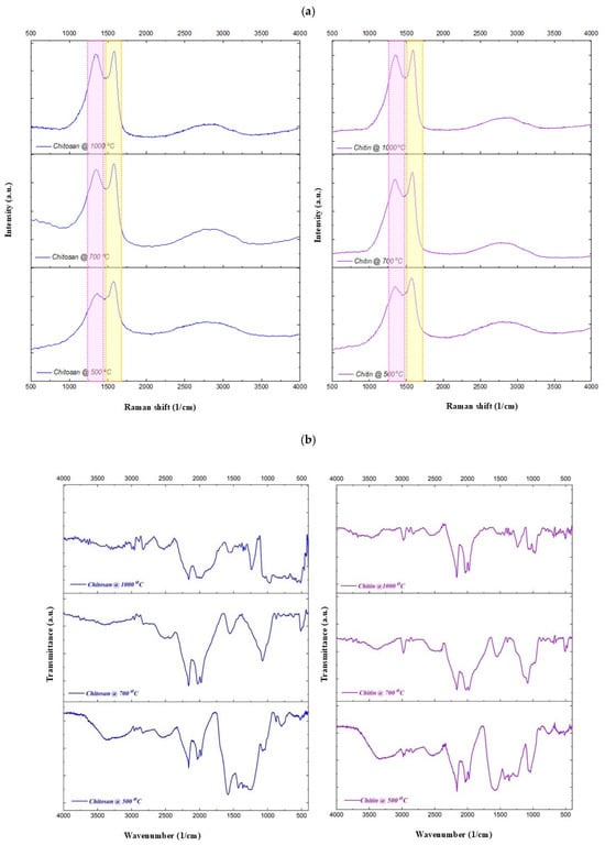 Raman (a) and FT-IR (b) spectra of carbonized products of chitin and chitosan at various temperatures.