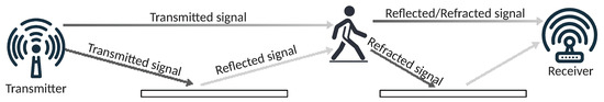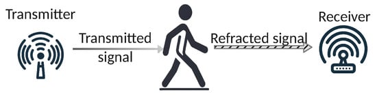 Radio Frequency (RF)-based passive human sensing (PHS) takes advantage of the modification induced in the RF signal by the presence of a human body along its pathway. When traversing a human body, the radio signal is refracted and attenuated, thus undergoing changes in its phase and intensity (see Figure 2). The signal can also be refracted and reflected by objects, furniture, and walls, thus generating multipath signals. All these types of signals must be captured, filtered, and analyzed for PHS [23]. A general investigation of the effects of reflected and refracted components of the received signal on the accuracy and reliability of the passive detection process was investigated in several seminal works, such as in [29] and is outside the scope of this paper.