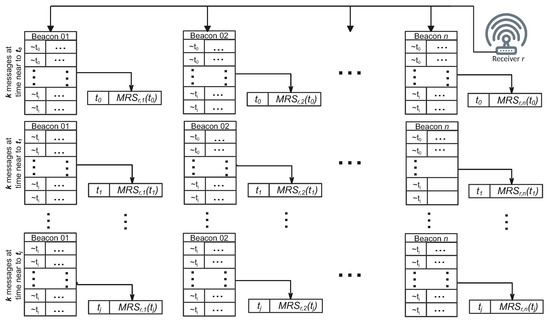 At each receiver, and for every time instant j at which a message is received, the median RSSI values from different beacons that share similar timestamps are compiled into a single row, labeled with the representative timestamp j. As a result, each receiver r maintains a list, denoted as , where each row corresponds to a specific time instant j and contains a sequence of values that are the median RSSI values received from the various beacons around that time.