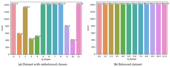 For the sake of generality of the pre-trained model, any bias and information on the prior probability distribution of the elements in each class (one class per each integer number of occupants in the range ), must be canceled; therefore, we randomized the samples in each dataset (that is, randomly re-sampled the datasets) in order to remove their original ordering information and balanced the number of elements in each class as follows: