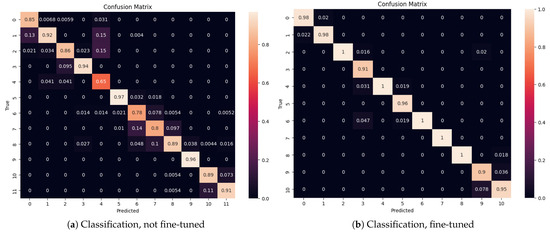 Figure 7a,b show the ACPR confusion matrix () for the hybrid CNN+LSTM model, not fine-tuned (a) and fine-tuned (b) with 350 samples per class, evidencing that the performance of the model is nearly uniform across all classes.