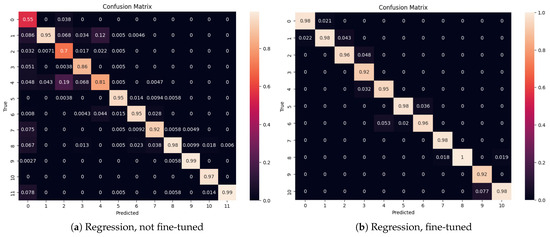 (a) ACPR confusion matrix () for the regression model CNN+LSTM, not fine-tuned. (b) ACPR confusion matrix () for the regression model CNN+LSTM, fine-tuned with 350 samples per class.