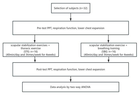 The subjects of the experiment were randomly selected from an opaque box containing ping-pong balls in two colors. Participants who picked the yellow ball were assigned to the SBG group, while those who picked the white ball were assigned to the STG group. A total of 32 subjects participated in the experimental data collection, which included muscle pressure pain threshold (PPT), respiratory function, and lower chest expansion (LCE). After 4 weeks of exercises, the muscle PPT, respiratory function, and LCE were measured again. The entire assessment process was conducted by professional physical therapists. In order to maintain the principle of blind selection, the assessors’ grouping of the objects remains unknown (Figure 1).