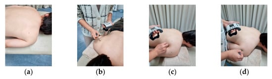 Measurement of muscle pressure pain threshold: (a) location of measurement; (b) infraspinatus muscle; (c) teres major muscle; and (d) posterior deltoid muscle.