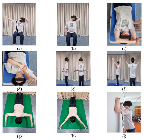 Scapular stabilization exercises: (a) levator scapular stretching; (b) upper trapezius stretching; (c) teres major stretching; (d) pectoralis minor stretching; (e) bilateral external rotation; (f) push-up exercises; (g) L-exercises; (h) Y-exercises; and (i) wall-slide exercises.