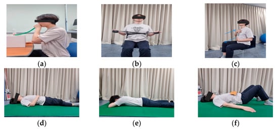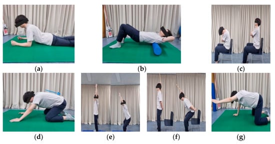 Stretching exercises (Figure 5a,b) include rectus abdominis stretching and thoracic mobility exercises for 45 s. Strengthening exercises (Figure 5c) include thoracic extensor muscle strengthening. Movement exercises (Figure 5d–g) include backward rocking, posture, and thoracic stabilization exercises. Three sets of eight were carried out, held for 15 s in each set. Movement occurs via a combination of movements by Kwon et al. and Kang [18,25].