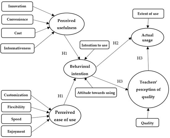 Perceived utility (PU) and perceived ease of use (PEU) are the two core characteristics of TAM [37]. Through PU, educators assess a technology’s potential to enhance their professional growth and the effectiveness of their instruction. Simultaneously, PEU reflects their perception of the technology’s user-friendliness, intuitiveness, and the minimal effort needed to integrate it into daily tasks. These fundamental concepts have evolved, with subsequent studies introducing additional explanatory elements such as adaptability, responsiveness, and creative levels [38,39]. These enhancements have strengthened TAM’s ability to represent the dynamics of technology adoption in modern learning environments. Building on this theoretical framework, we propose the following hypothesis: