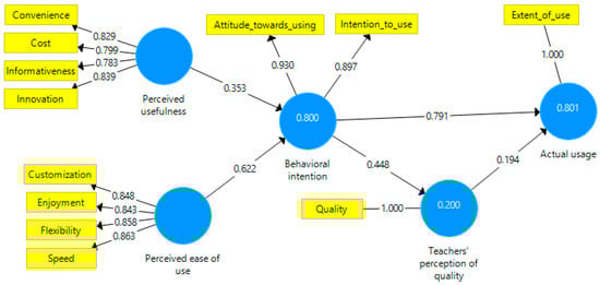 All the hypothesized paths are statistically significant (p < 0.001). Behavioral intention strongly predicts actual usage, while perceived ease of use has a greater impact on shaping behavioral intention than perceived usefulness. Teachers’ perception of quality has a minor but important effect on actual usage (Table 6).