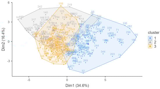 Figure 1 shows the clustering results in two dimensions. However, the optimal number of clusters (k = 3) was not determined from the visual representation but through statistical methods applied to the entire dataset. Specifically, the gap statistic was computed using the complete set of performance variables, not just the first two principal components. This approach ensures that the number of clusters reflects the full multidimensional structure of player performance. The use of a 2D cluster plot is intended solely for visual interpretation, where Dim 1 and Dim 2 serve as a projection of the original dataset, capturing over 50% of the total variance. Therefore, the three-cluster solution visualized in the figure is based on the full dataset and is not limited by the reduced dimensionality of the plot. These clusters represent distinct roles that players fulfill in women’s basketball beyond the traditional positions.