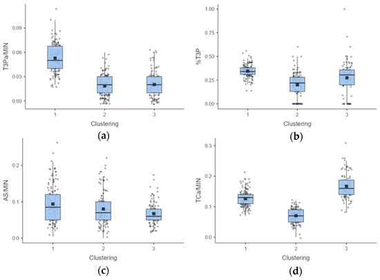 Significant variables. Cluster 1: perimeter specialists. This analysis highlights the comparison among the three clusters in key performance metrics, including three-point shots made (a), three-point shooting efficiency (b), assists (c), and field goals made (d).