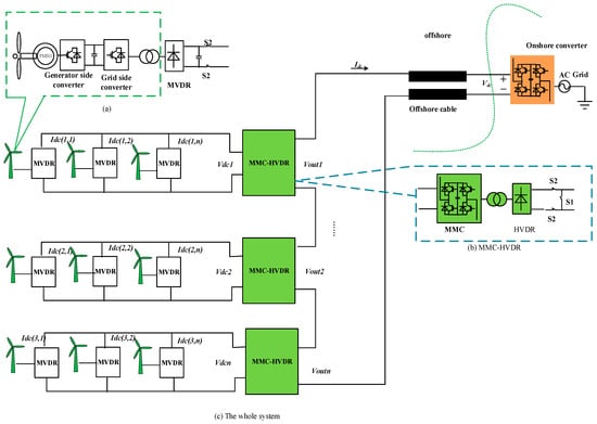 The topology of a parallel–series DR system. (a) The topology of wind turbine and MVDR; (b) The topology of MMC-HVDR; (c) The whole system topology.