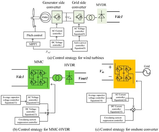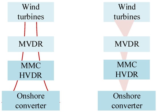 The diode rectifier (DR)-HVDC is composed of grid-forming wind turbines, a diode-based rectifier, and an onshore converter. Prior literature details solutions for the wind turbine control strategy and start-up issues [5,6,7,8,9]. However, it is difficult to realize coordinated control among hundreds of wind turbines. According to the mechanism for the grid-forming control strategy, large reactive power is needed to maintain the frequency of the offshore wind farm, which may influence the active power of the wind turbines. Synchronization issues exist if the cables are long.