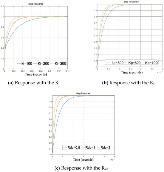 According to Figure 3a, the transfer function is built for stability analysis, as shown in Figure 4. Moreover, the response under different control parameters is shown in Figure 5; it can be seen that with a larger Kp and Ki, the system will respond faster.