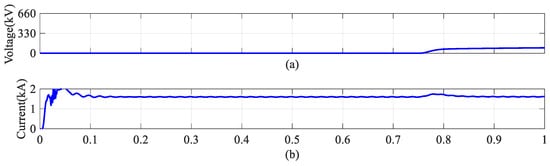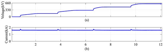 When a power imbalance occurs, the unit’s output voltage with the higher power will exceed its rated value. In addition, once a HVDR unit is out of operation, its power command is 0, and the remaining units will operate in an overvoltage state even if their power remains balanced. However, considering system safety and insulation voltage costs, the output voltage of the HVDR should be limited. The output voltage curves for two units are shown in Figure 2a.