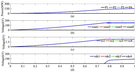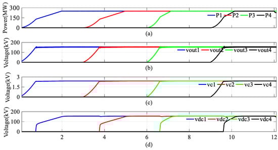 Firstly, at t = 0 s, the onshore MMC starts charging the submodule capacitors and establishes a DC link current. At t = 0.05, the DC current reaches 1.5 kA, as shown in Figure 7b, and the DC voltage is nearly 0, as shown in Figure 7a. Then, at t = 0.2 s, the first wind turbine string starts up, as shown in Figure 8. The wind turbine gradually outputs active power P1, charging the DC capacitor in the MVDR, the submodule capacitor in the MMC, and the DC output port capacitor in the HVDR to establish the DC voltage vout1 and vdc1 in the parallel wind farm string. At t = 0.8 s, the active power of the wind farm string is 100 MW, the DC voltage of MVDR reaches its rated value of 160 kV, the submodule capacitor voltage of MMC vc1 reaches 2.5 kV, and the HVDR output voltage is 100 kV. As the active power output of the wind turbine increases, according to Equation (6), with the increase of active power, at t = 2 s, the active power of the wind turbine reaches its maximum value of 250 MW, and the DC voltage of HVDR reaches its rated value of 160 kV. The first string of wind turbines has started and is being completed. Subsequently, the other strings are started in sequence, as shown in Figure 9. At t = 3 s, the second string of wind turbines starts at t = 4.5 s. The third string of wind turbines starts at t = 6 s and completes the start-up at t = 7.5 s. The fourth string of wind turbines starts at t = 9 s and completes the start-up at t = 10.5 s. Figure 9 shows no fluctuation in the capacitor voltage in the MMC submodule during the start-up process. It can be concluded that the parallel–series topology is decoupled from other branches during start-up. As shown in Figure 10a, as the wind turbine series gradually starts, the DC voltage in the HVDC line gradually increases to 640 kV. The DC current in the HVDC line does not change during the start-up process, as shown in Figure 10b.