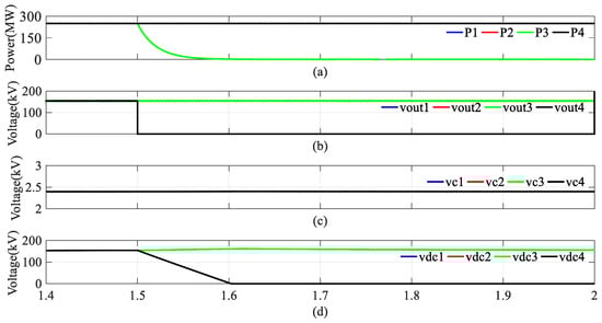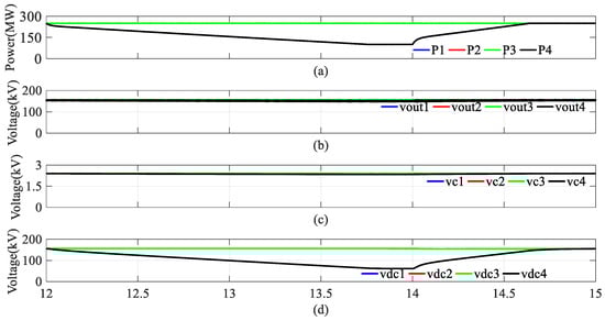 When a DC fault occurs, the DC voltage in the MMC, Vout4, decreases to 0, as shown in Figure 13b. Due to the coupling effects in the DR in Section 3.1, the power generated by the wind turbines gradually decreases to 0, as indicated in Figure 13a. As the MV side DC current rises during the DC fault, the submodule in the MMC will be quickly blocked, and the capacitor voltage in the MMC-HVDR in the faulty branch remains almost unchanged, as seen in Figure 13c. Once the MMC-HVDR stops the active power transmission, its output voltage Vdc4 drops to 0, as shown in Figure 13d. The voltage and current in the HVDC link are shown in Figure 14. The fluctuation in the DC current was minimal, while the DC voltage in the HVDC link decreased to 480 kV as the power diminished. The results presented in Figure 9 and Figure 10 highlight that the proposed topology has the capability of DC fault isolation. It can be concluded that the parallel–series topology is decoupled from other branches during a DC fault.