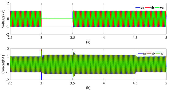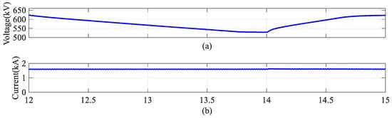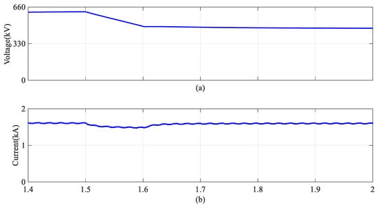 The waveforms for HVDC links. (a) The DC voltage of HVDC link; (b) The DC current of HVDC link.