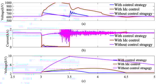 At t = 3 s, a three-phase AC grounding fault occurred on the onshore AC grid, causing the AC voltage to drop to zero, as shown in Figure 15a. An overcurrent can be observed during an AC fault, as shown in Figure 15b. Consequently, the active power generated by the wind turbines could no longer be transmitted to the grid and accumulated at the converters. Due to the constant DC current control employed by the onshore converter, the DC current in the HVDC link remained stable during the first phase of the AC fault, assuming no additional control strategies were applied. The active power from the wind turbines continuously feeds into the onshore converter, leading to a steady increase in the capacitor voltage of the submodule, as seen in Figure 16c. The onshore converter is composed of the FB submodule, and under the modulation effect, the DC voltage in the HVDC link remains unchanged in the early phase of the fault, while the submodule capacitor voltage continues to rise. As a result, neither the MMC-HVDR nor the MVDR can detect the fault, and the active voltage limiting feature in the DR is not triggered. Without an additional control strategy, the vout1, Vdc1, and Vc1 values remain constant, as shown by the pink curve in Figure 16.