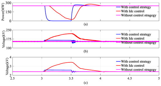 Once the overvoltage of the capacitor is detected, the active voltage rapid injection method proposed in this article will operate immediately, and force the intermediate variable AC voltage in the grid-side converter to be lower than the DC voltage. The active power transmission path is blocked quickly. This reduces the accumulation of active power in each stage and reduces the overvoltage, as shown by the blue curve in Figure 16c. Under the control strategy proposed in this article, the system achieved onshore AC fault ride-through.