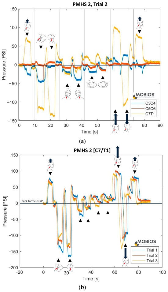 Experimental data showing (a) cervical IVD pressure readings are successfully obtained for all three cervical IVD levels [C3/C4, C5/C6, and C7/T1] for PMHS 2 during motion trial 2 with (b) successful repeatability at each disc level between the three motion trials [e.g., C7/T1 disc level repeatability for PMHS 2].