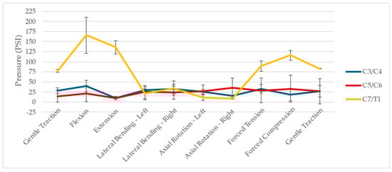 A summary of mean absolute pressure values for all trials for both specimens is reported in Table 2 (full data set is available in Table A1). The average cervical IVD pressure in the gentle traction position was 42.53 +/− 11.83 PSI, and both the beginning and ending gentle traction positions showed comparable peaks. Maximum overall pressures were recorded in the C7-T1 discs, with flexion resulting in the highest pressure (165.71 +/− 44.53 PSI), extension the next highest pressure readings (135.96 +/− 16.75 PSI), followed by forced compression (115.84 +/− 12.37 PSI). More commensurate pressure values were recorded in the C3-C4 and C5-C6 discs (average across all motions 25.85 +/− 8.73 PSI and 24.36 +/− 20.52 PSI, respectively), and these pressures were much lower than those recorded at C7-T1 (average across all motions 74.08 +/− 13.27 PSI) (Figure 5).