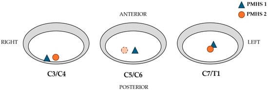 Pressure sensor placement within the cervical IVDs’ transverse plane, locations approximated from CT scan imaging. The outer shaded contour represents the approximate area of the cervical disc annulus fibrosis, and the inner contour represents the approximate area of the cervical disc nucleus pulposus. For PMHS 2, the pressure sensor at the C5/C6 level is known to be erroneously/manually displaced and replaced multiple times between the motion trials. The estimated initial sensor position at the C5/C6 level for PMHS 2 is represented by the dashed line.