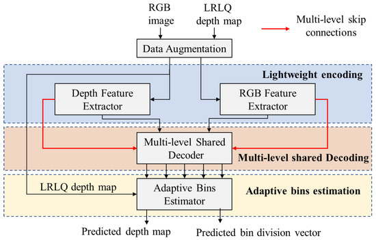 In the proposed depth estimation network, the inputs captured by MR glasses are RGB images and low-resolution low-quality (LRLQ) depth maps. The RGB image and the corresponding LRLQ depth map are fed into the feature extractors to extract their high- and low-level features separately. Those encoded features of image and depth are fused as multilevel dense depth features in a multilevel shared decoder. The multilevel shared decoder then decodes these dense features at different levels as the inputs of an adaptive bin estimator, as Figure 1 shows. The adaptive bins estimator conducts the prediction of bin divisions, which can delineate the depth distributions of current scenes. As a result, each high-resolution depth can be resulted from the linear combination of centers of divided bins with the bins’ probabilities. In our proposed network, the division of bins is hereafter named the bin-division vector, which contains the consecutive bins where a bin records the granularity (range) of a depth fragment.