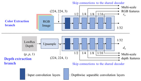 The proposed encoder is designed as a lightweight dual-path feature extractor where one path is called the RGB extraction branch and another is called the depth extraction branch, as shown in Figure 2. Their backbones with MobileNet-s can provide the multi-scale input features for the multi-level shared decoder. The inputs of the proposed encoders are the RGB image with a size of 224 × 224 × 3 and the LRLQ depth map with a size of p × p × 1, where p = 8 is set for the Jorjin J7EF Plus AR glasses [19]. The HR RGB image and LRLQ depth map are fed into the color extraction branch and depth extraction branch, respectively, so that the LRLQ depth maps are bi-linearly interpolated to the same spatial dimension as the RGB images before being fed into depth extraction branch.