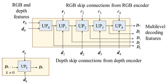 Architecture of the multilevel shared decoder with multi-scale input features of depth and RGB.