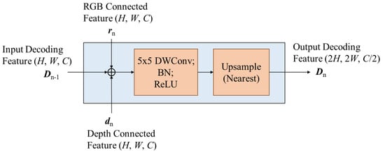 For applications in low-resource apparatuses and mobiles, the design of the upsampling block must be very lightweight to fit the restrictions of the target hardware. Therefore, we suggest a simple high-efficiency module for the upsampling block called SimpleUp. As shown in Figure 4, the encoding results rn and dn are blended with the last-level decoding result Dn−1 together in the nth upsampling block (UPn) by element-wise addition. We adopt element-wise addition rather than concatenation, because concatenation will increase the channels of features and consume additional resources for the subsequent convolution operation. SimpleUp consists of a 5 × 5 convolution kernel to reduce the channel number by half followed by bilinear interpolation to double the spatial resolution at each layer. In the convolution layers of SimpleUp and UpCSPN-k, depthwise separable convolution is adopted over standard convolutions to further reduce the parameters of the decoding layers. At the beginning of SimpleUp and UpCSPN-k, element-wise addition is applied to blend the RGB features and depth features. In Figure 3 and Figure 4, the first decoding result D0 of the multilevel shared decoder has 512 channels, i.e., C = 512.