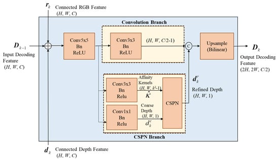 In Figure 5, the convolution branch performs one 3 × 3 standard convolution with batch normalization to output features of size (H, W, C/2-1). Meanwhile, the CSPN branch is composed of two prediction heads, which produce a coarse depth map with a size of (H, W, 1) and a predicted affinity map with a size of (H, W, k2-1), where k is the kernel size of the CSPN. For each pixel x in , the convolution weights of the channels can help to convey the information of pixels through the spatial average.