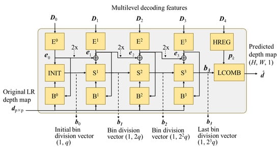 After performing multilevel shared decoding, the multilevel decoding features, D0, D1, D2, D3 and D4 are sent to the proposed adaptive dynamic-range bin (AdaDRBins) estimator. The AdaDRBins estimator employs these multilevel decoding features and the original LRLQ depth map, dpxp, to produce the bin division patterns, i.e., the set of bin-division vectors {b0, b1, b2, b3} and the finally predicted depth map , as Figure 6 shows. The ith component (i.e., the ith bin) of nth bin-division vector, bn, is hereafter denoted by .