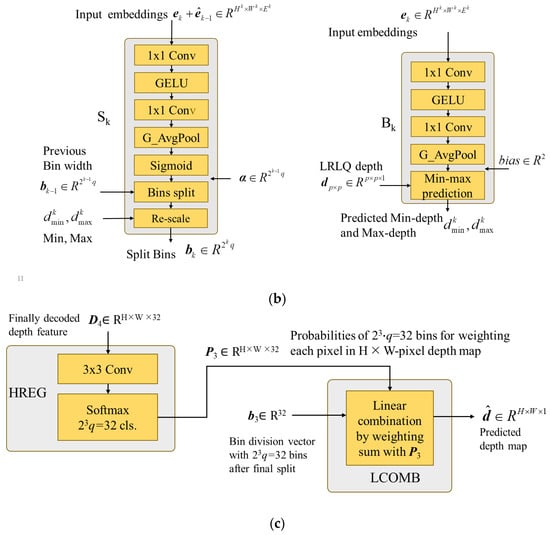 The final stage in the AdaDRBins estimator is the hybrid regression layer (HREG) and linear combination (LCOMB), which are detailed in Figure 7c. After the prediction of these MLPs, the final bin-division pattern b3 is obtained. In the final stage of AdaDRBins, HREG is used on the final decoded feature D4 to estimate the probabilities of each pixel falling into these bins. The hybrid regression layer consists of a 3 × 3 convolution followed by a Softmax activation unit, which results in the predicted probability pi for the ith bin. Then, the predicted probabilities are applied to perform LCOMB with the predicted final centers of the bins , which are given by