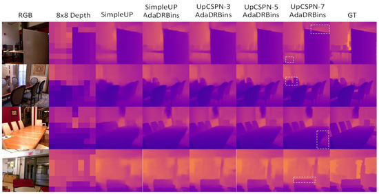 Qualitative results achieved by the proposed networks that the model with the UpCSPN-7 + AdaDRBins decoder achieves the best results, specially marked by white dash-line rectangles which highlight the clearer depth edges.