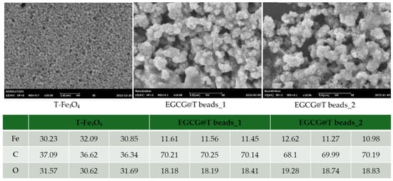 The synthesized magnetic beads and EGCG complex (EGCG@T) were analyzed using scanning electron microscopy (SEM) and energy-dispersive X-ray spectroscopy (EDS). It was confirmed that EGCG aggregated with the spherical magnetic beads to form clusters. In addition, the EDS analysis results showed that T-Fe3O4 was composed of 31.06% Fe, 36.68% C, and 31.69% O. On the other hand, EGCG@T bead_1 was composed of 11.54% Fe, 70.20% C, and 18.26% O, and EGCG@T bead_2 was composed of 11.62% Fe, 69.43% C, and 18.95% O, confirming that the magnetic beads and EGCG were present and mixed since the composition ratio of C increased.