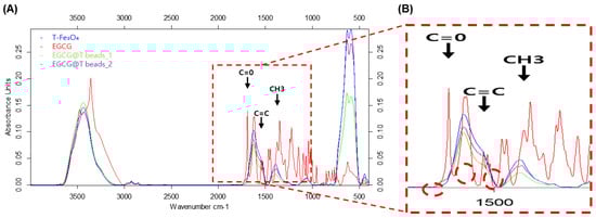 Results of chemical composition and molecular structure analyses using FT-IR. (A) Overall analysis results for T-Fe3O4, EGCG, EGCG@T Beads_1, and EGCG@T Beads_2; (B) magnification of the red dashed box region.