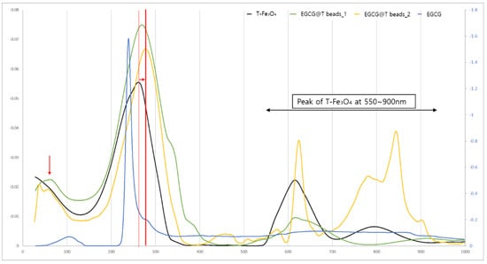 It was confirmed that the peak in EGCG@T bead spectra was due to the 100 nm peak of EGCG. In addition, it was confirmed that the EGCG@T beads’ peaks were shifted compared to the T-Fe3O4 peak due to the 280 nm peak of EGCG. Therefore, it was confirmed once again that T-Fe3O4 and EGCG were present in a complex form.