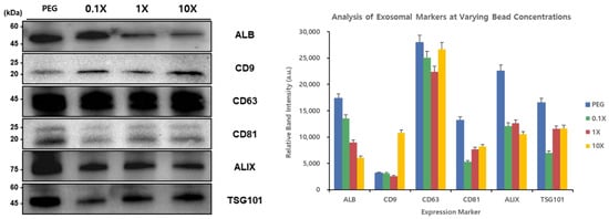 All comparative experiments were performed with PEG precipitation as a control. The quality and quantity of exosomes obtained from each condition were evaluated by comparing the expression of key exosomal marker proteins (THP, ALB, TSG101, CD9, CD63, CD81, and ALIX) through Western blot analysis. Various parameters including bead concentration, binding time, temperature, number of washing steps, and elution buffer composition were systematically evaluated, confirming that the protocol presented here provides the most efficient conditions for isolating exosomes from various types of biological specimens.