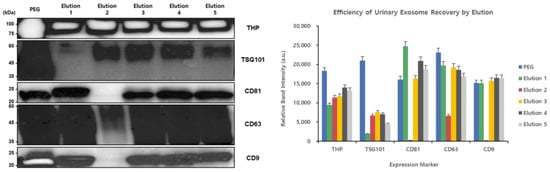 The Western blot results showed that THP exhibited significantly higher levels with all the bead-based extraction conditions (elutions 1–5) compared to the PEG precipitation method and RIPA buffer control. This indicates that bead-based extraction methods can effectively concentrate THP from urine samples. For TSG101, it was barely detectable in the PEG precipitation method and RIPA buffer samples, but showed the highest levels in the elution 2 and 3 samples for the bead-based extraction method. This suggests that the bead-based approach, particularly the elution 2 and 3 conditions, is effective for isolating TSG101-positive exosomes. CD81 showed a clear presence in the PEG precipitation method samples, RIPA buffer samples, and Sample 1, but was barely detectable in the elution 2 samples. In contrast, strong expression was observed in the elution 3, 4, and 5 samples. CD63 exhibited low levels under most conditions, but a uniquely strong band was observed in the elution 2 samples for the bead-based extraction method. CD9 showed high levels in the PEG precipitation method samples that were used as a control, while among the bead-based extraction method samples, it showed moderate levels in the elution 1 samples and minimal levels in the elution 2 samples. However, high levels were observed in the elution 3, 4, and 5 samples.