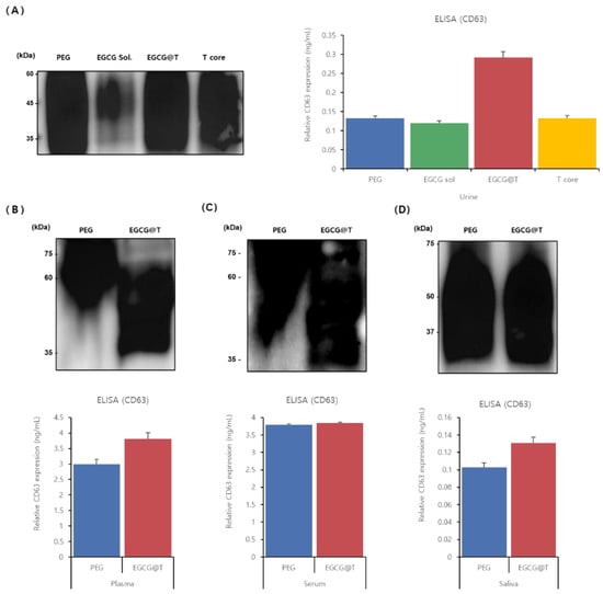 To evaluate the differences in CD63 levels based on the exosome isolation method, both Western blot and ELISA analyses were performed for four types of biological samples: urine, saliva, plasma, and serum (Figure 9). For urine samples, exosomes were isolated using PEG precipitation, an EGCG solution (EGCG Sol.), the EGCG-modified magnetic beads (EGCG@T), and the magnetic bead core (T core). The Western blot analysis showed detectable CD63 (~45–60 kDa) levels using all the methods, with particularly strong bands observed in the PEG, EGCG@T, and T core samples. The EGCG Sol. group showed relatively weak levels. The EGCG@T method yielded the most intense and distinct CD63 bands. ELISA quantification confirmed this trend, revealing the highest CD63 levels with EGCG@T (0.29 ng/mL), over twice that with PEG (0.13 ng/mL), EGCG Sol. (0.12 ng/mL), and T core (0.13 ng/mL). These results suggest a synergistic effect of EGCG and magnetic beads in enhancing CD63-positive exosome isolation from urine.