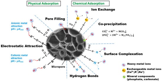Heavy metal (HM), e.g., cadmium, mercury, and chromium, poisoning in wastewater is a major contributor to global health and environmental problems [13]. Adsorption is considered a highly effective and versatile approach for removing both inorganic and organic contaminants from various water sources, including natural water bodies, drinking water, sewage, and industrial effluents. The advantages involve cost efficiency, ease of use, global availability of adsorbents, design flexibility, and environmental sustainability [14]. For heavy metal removal, SDB provides a cost-effective and environmentally friendly solution. Its porous structure has a large surface area for adsorption, and its surface functional groups, including carboxyl, phenolic, and hydroxyl groups, can form chelates with metal ions. The adsorption mechanisms include physical adsorption (metal trapped within the pores) and chemical adsorption (metal ions form complexes with the functional groups of the biochar) (Figure 1). Recent studies have shown that SDB is highly efficient in removing heavy metals, with removal rates typically exceeding 90% under optimal conditions [15,16]. SDB inherently contains metal oxide minerals and polar groups that confer strong metal sorption. The incorporation of inorganic modifiers, e.g., metal oxides, into SDB can substantially boost its HMs adsorption performance, primarily through improvements in the abundance of reactive functional groups, and introduce additional active binding sites. [17]. For instance, CaO-modified SDB achieved 99.74% Cd2+ removal, approximately three times higher than raw SDB under identical conditions. However, while surface activation increases adsorption capacity, it may also reduce material stability over repeated use cycles. Even without modification, SDB can effectively sequester metals such as Cu, Pb, Cr, and Cd through surface complexation and precipitation. Notably, iron-enriched SDB demonstrates exceptional Cr(VI) removal by facilitating its reduction to Cr(III) followed by adsorption [18]. Another effective strategy involves phosphate-based modification, where SDB treated with ammonium polyphosphate exhibits improved Cd adsorption due to the introduction of phosphate functional groups [19]. These studies underscore that chemical activation or doping can dramatically improve metal binding and thereby enhance heavy metal removal. However, the potential leaching of intrinsic metals (e.g., Fe, Zn, and Cu) or previously adsorbed contaminants under acidic or dynamic conditions necessitates a careful assessment of secondary pollution risks associated with SDB reuse.