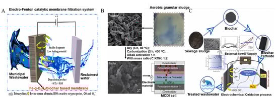 Representative applications of sludge-derived biochar (SDB) in membrane-based wastewater treatment systems: (A) Fe/N co-doped biochar-based catalytic membranes used in electro-Fenton systems [65]; (B) aerobic granular sludge-based biochar applied in membrane capacitive deionization [60]; (C) binder-free SDB electrodes integrated into electrochemical advanced oxidation processes [64]. Copyright, Elsevier.