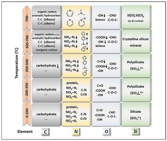 Presence of functional groups on biochar with increasing temperature. Reprinted with permission from Yalasangi et al. [3]. Copyright 2024, Elsevier.