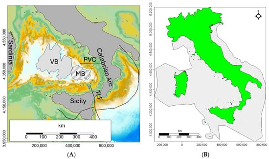 (A) SE Tyrrhenian Sea. PVC is the Palinuro Volcanic Chain, VB: Vavilov Basin; MB: Marsili Basin. TLF: Tindari–Letojanni Fault. (B) The Italian Exclusive Economic Zone (EEZ).