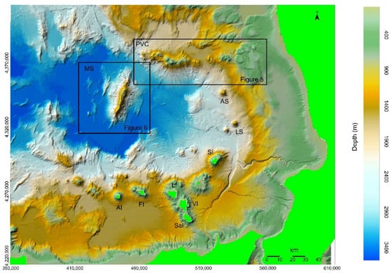 The Palinuro Volcanic Chain (PVC), approximately 90–100 km long, consists of 15 volcanoes aligned in an east–west direction, with heights up to 3200 m above the surrounding seafloor [39]. The presence of calderas (to the west), fracture systems, and canyons provides evidence of instability [40,41]. Additionally, the PVC is influenced by hydrothermal activity that can weaken volcanic rocks [42,43]. Lower seismicity, possibly related to hydrothermal activity, has also been detected [44]. Different styles of volcanism are clearly visible, grouped into three sectors that differ in morphologic characteristics [40], including cones, calderas, and structurally controlled volcanic features [45], and located at depths ranging −84/−2600 m below sea level.