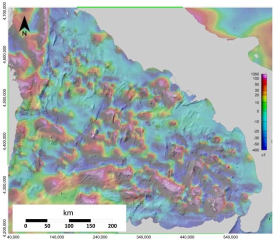 In the framework of the qualitative analysis of the Tyrrhenian crustal magnetic anomaly field, the magnetic map of Italy [53] is presented in Figure 4. The analysis aims to describe the general pattern of the field and to identify potentially productive areas from a mining perspective, as defined by their magnetic properties. The map here reported represents the integration of various marine and terrestrial surveys and was created using data acquired by the Osservatorio Geofisico Sperimentale (OGS) between 1965 and 1972, as well as data from measurement campaigns conducted by the Istituto Nazionale di Geofisica e Vulcanologia (INGV) within the framework of the Geodynamics Finalized Project of the National Research Council from 1977 to 1981. The marine dataset used for the compilation of the map refers to oceanographic campaigns organized by the National Research Council (CNR) between 1965 and 1972 in the Mediterranean and conducted by the National Institute of Oceanography (OGS). The surveys in the Tyrrhenian Sea and in the study area form a dense set of acquisition lines striking mostly in the NS and EW directions. Measurements were taken at a speed of 10–12 knots using a proton precession magnetometer whose sensor, mounted on a fish, is towed 200–300 m below the boat. The Loran C system was used for positioning the measurements. Data processing involved the reduction of the diurnal variations using the geomagnetic observatory of L’Aquila (centrally located with respect to the extent of the marine surveys) and data reduction to a common epoch (1979.0). The magnetic anomaly is then obtained by removing the core magnetic main field (CMT) using the Molina and De Santis, 1987, model (ItGRF) [54]. Measurement leveling and the removal of the residual line errors were applied by using a crossover analysis and filtering of the total magnetic intensity field (TMI).