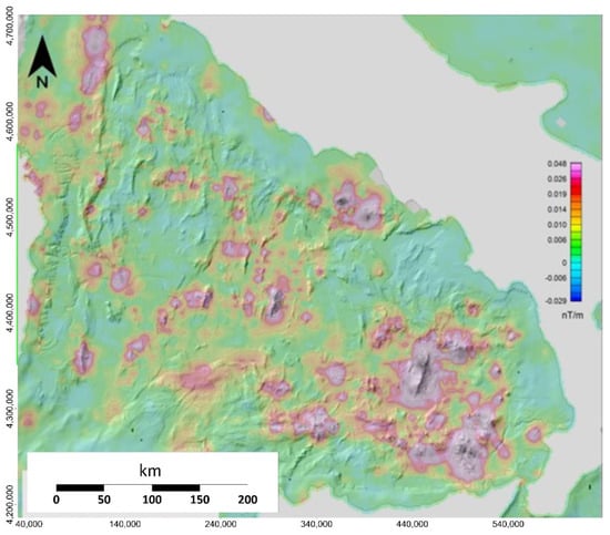 Of course, deep-sea areas potentially eligible for mining activities are more interesting because they are less exposed to environmental damage. In this sense, partially demagnetized sectors inside magnetic bodies are more interesting because these are the areas presumably affected by demagnetization due to the presence of hydrothermal vents. Crustal demagnetization is a common feature in basalt-hosted hydrothermal vent fields at slow- and ultra-slow-spreading mid-ocean ridges and caldera hydrothermal areas, primarily due to the removal of magnetic minerals by hydrothermal alteration processes and thermal demagnetization [104,105].