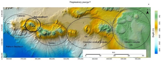 Morphology of the Palinuro Volcanic Chain, composed of several seamounts and different morpho-volcanic items. GS: Glabro Seamount; ES: Enotrio Seamount; OS: Ovidio Seamount. The rejuvenation area (black circle within the caldera’s frame) seems to be the most promising for DSM.